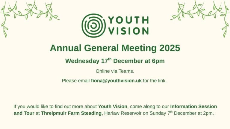 We are holding our Annual General Meeting on the 17th December at 6pm. It will be an online meeting. Email fiona@youthvision.uk and she will send you the link!